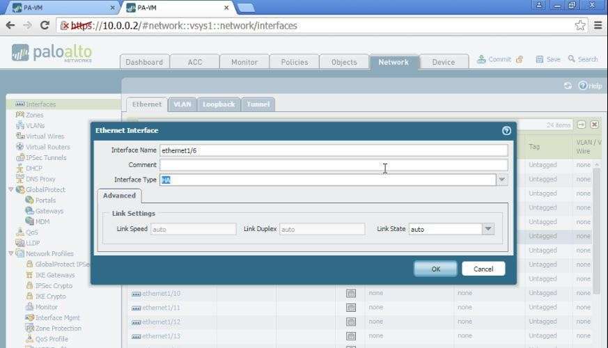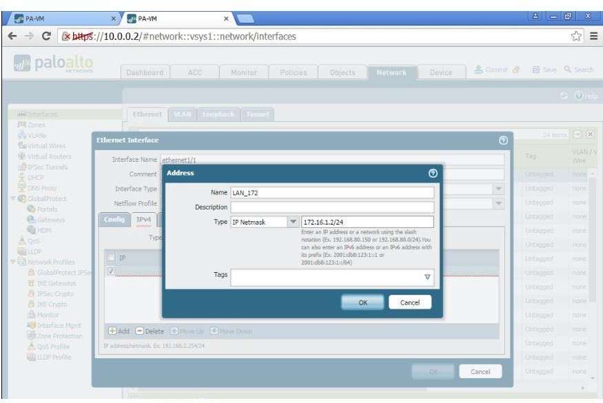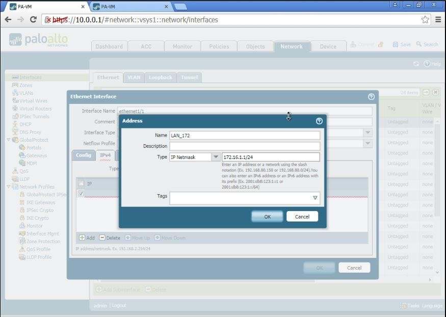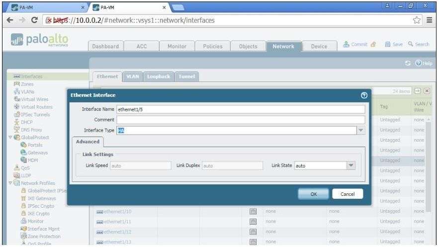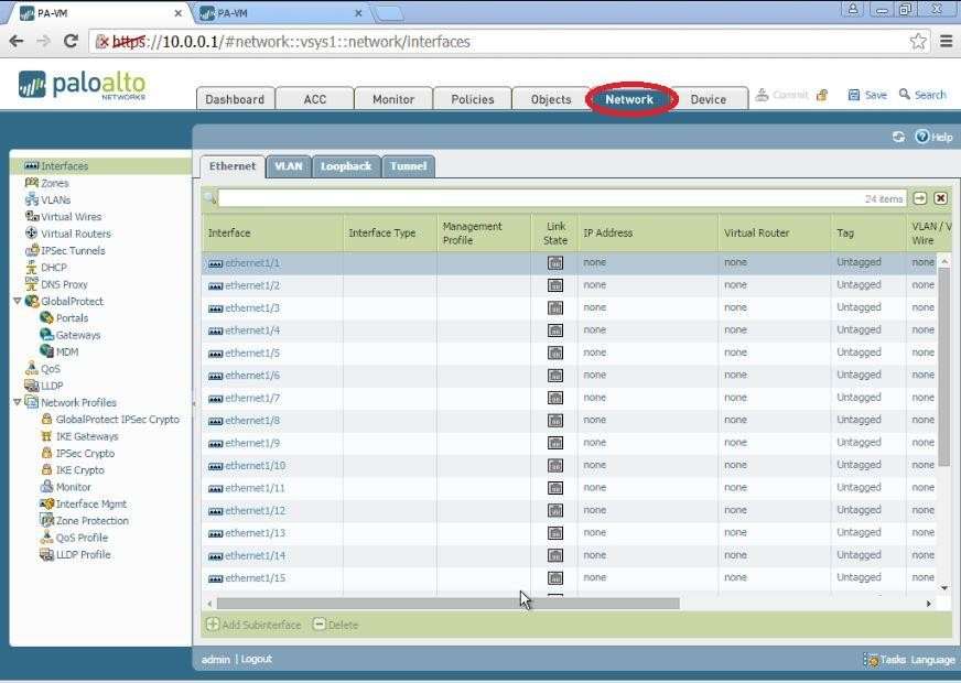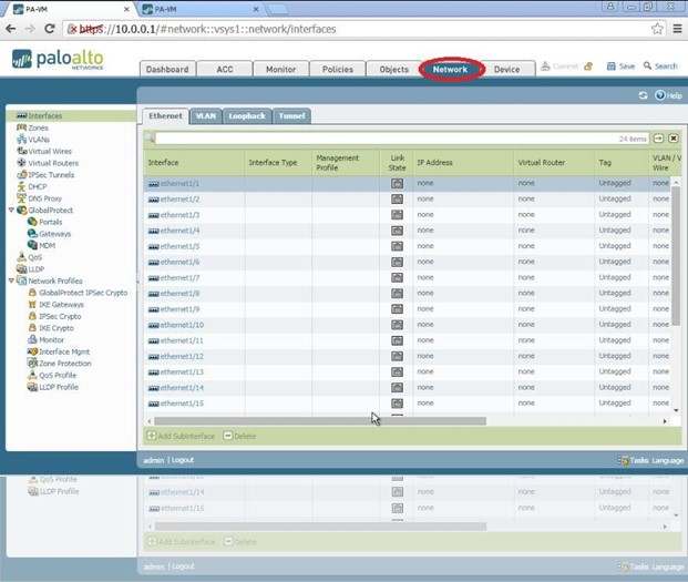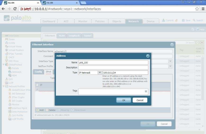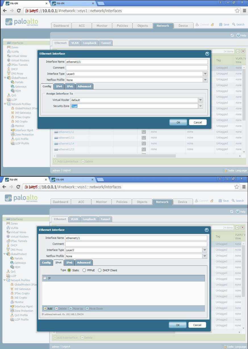 Now configure Interfaces of PaloAlto01 and assign IP address on it as shown in Screenshot. Click on Netwok Tab