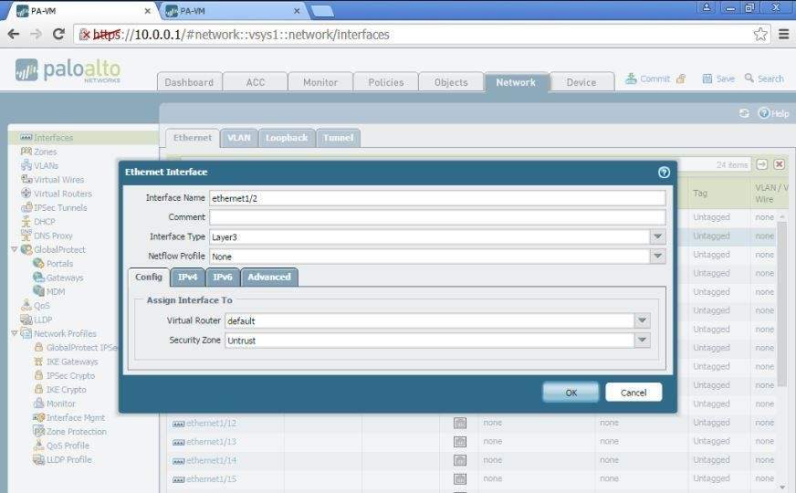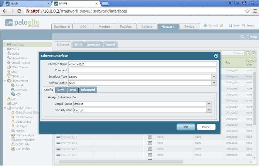 Now configure Ethernet1/2, interface type: layer3, virtual Router: default, security zone: untrust
