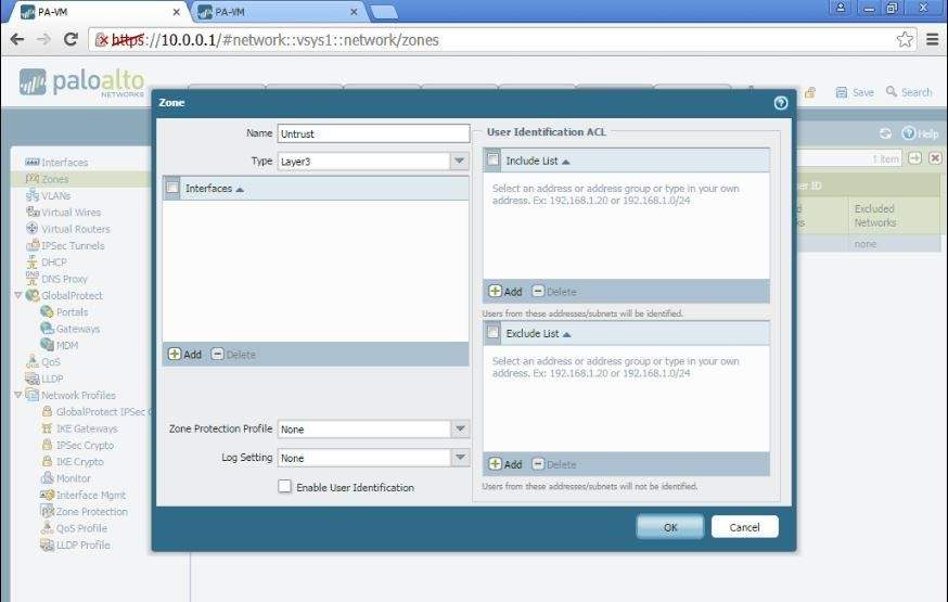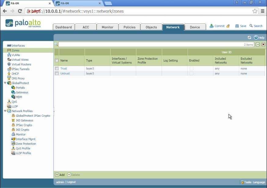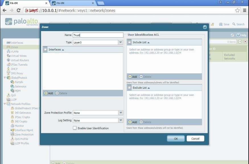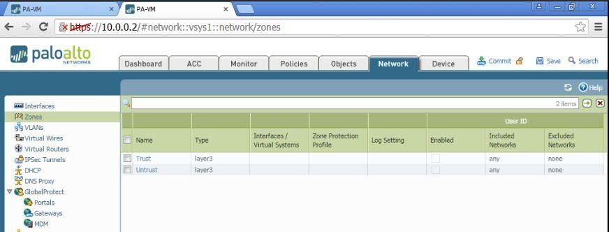 Now configure Interfaces of PaloAlto02 and assign IP address on it as shown in Screenshot. Click on Network Tab then click on zones create zone Trust and Untrust