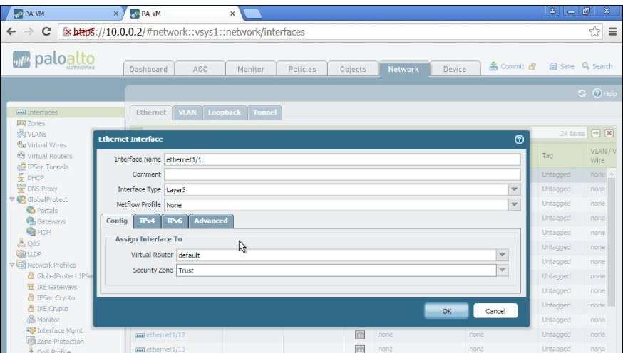 Here we Configure Ethernet1/1, Interface type: Layer 3, Virutal router: default and Security Zone: Trust
