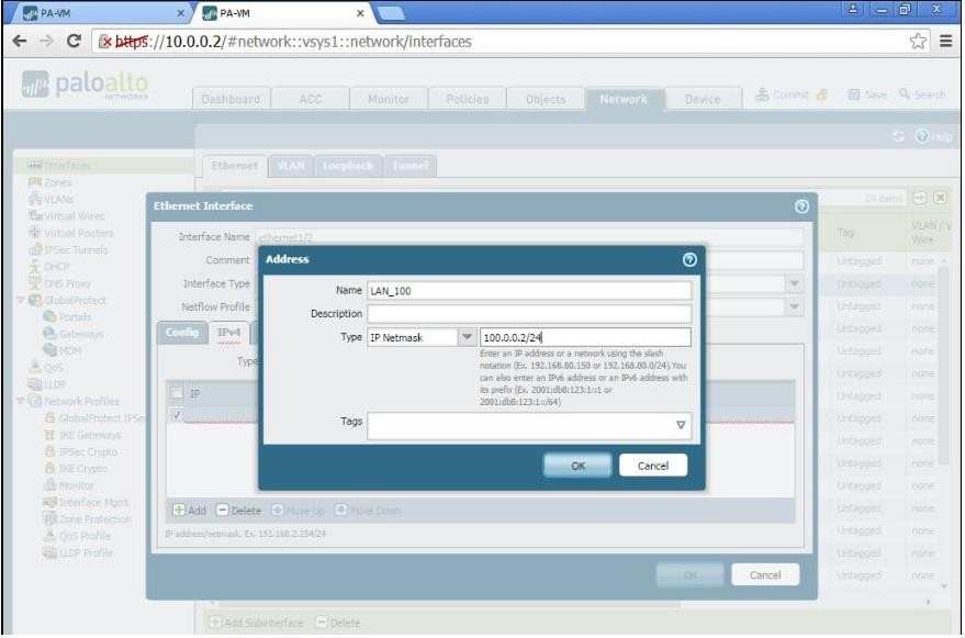 1.3 On PaloAlto01 assign IP address 172.16.1.1/24 on Interface Eth1/1 and IP address 100.0.0.1/24 on Interface Eth1/2. Also assign IP address 1.1.1.1/29 on Interface Eth1/5 and IP address 1.2.2.1/29 on Interface Eth1/6
