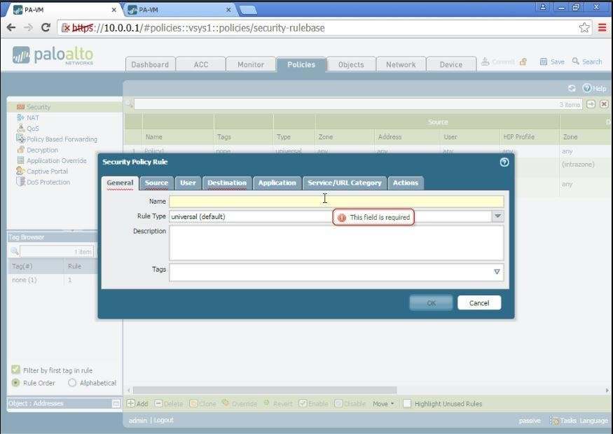 Also create a policy under security section name it Policy1 and in source tab mark is any and in destination tab also Any