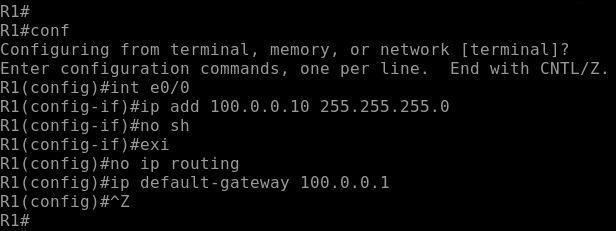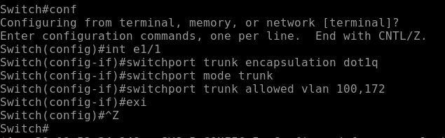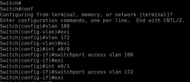 1.2 Configure switch SW01 create vlan 100 and vlan 172. Assign interface in it. In vlan 100 add Ethernet0/0 and in vlan 172 add Ethernet0/1.