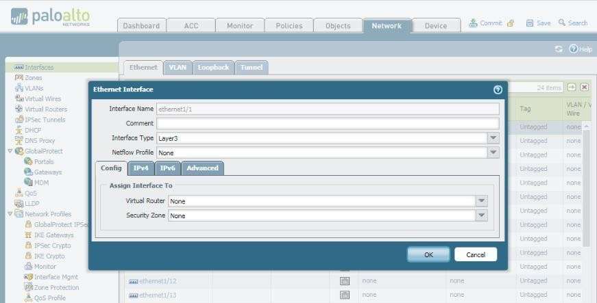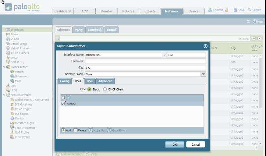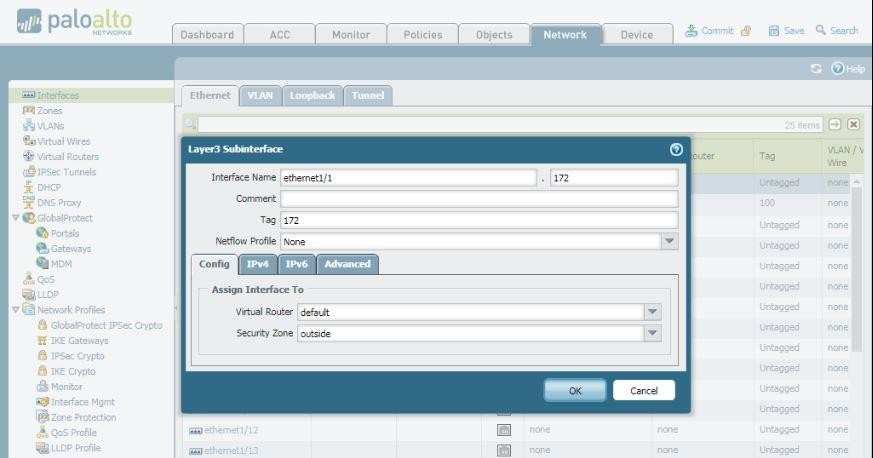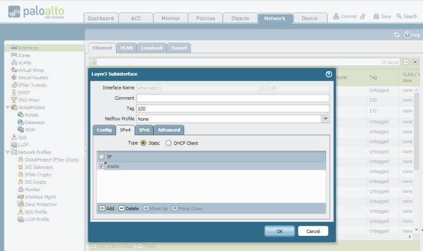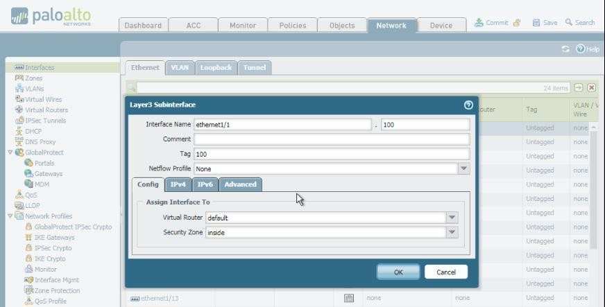 Here Ethernet1/1.100 will be sub interface number, in Tag field enter Vlan value 100 Security zone “Inside”.