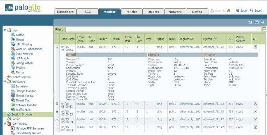 In below Screenshot we can Cleary see the ingress interface and Egress interface is ethernet1/1.100 and ethernet1/1.172 respectively.