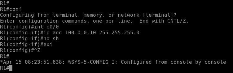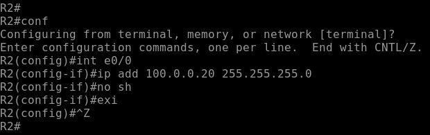 1.3 On Router R1 configure Ip address 100.0.0.10/24 and on Router R2 configure IP address 100.0.0.20/24.