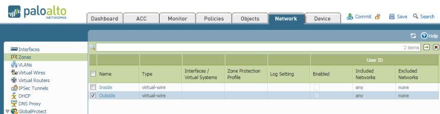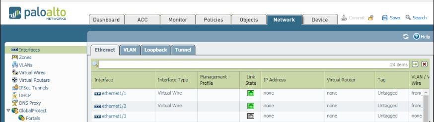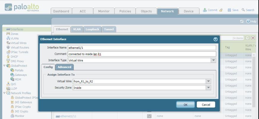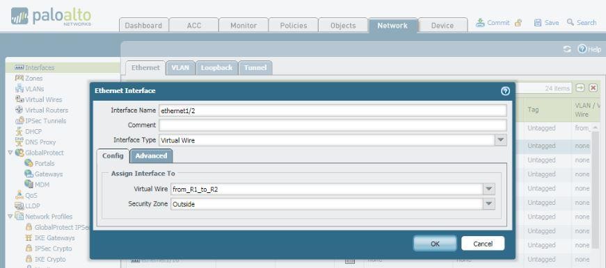 1.4 Configure PaloAlto interface Eth1/1 and Eth1/2 and select type of interface Virtual Wire.