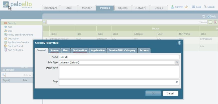 Now create a security policy for traffic to be inspected by the firewall.