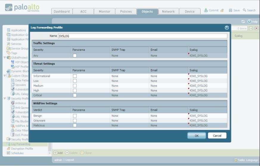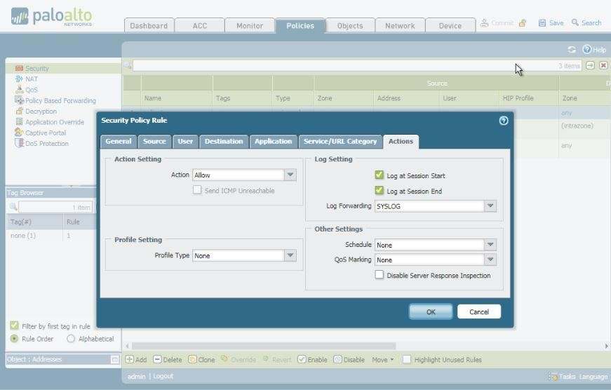 In security policy click on edit then go to Actions tab then check Log at Session Start, Log at Session End. In Log Forwarding Select SYSLOG then click ok.