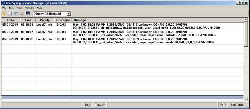 Now go to Palo Alto GUI and create any zone or do any configuration. Then come back to Kiwi Syslog application. And see the logs.